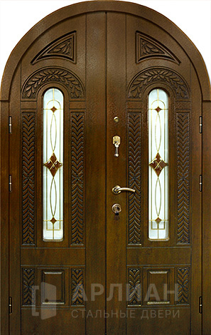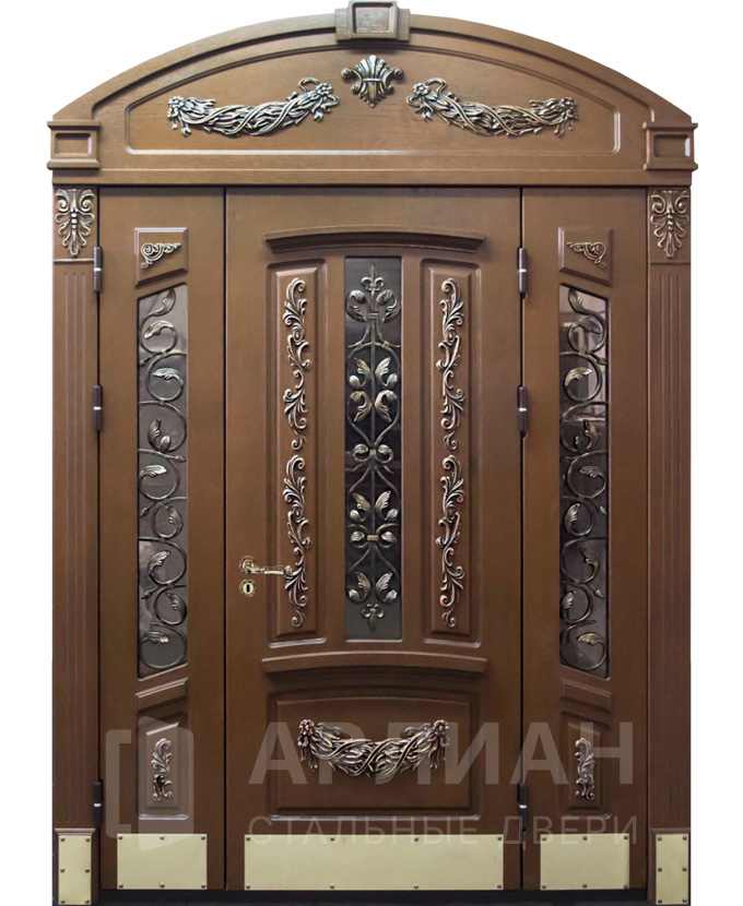 Кованая арочная входная дверь со стеклом и ковкой №69