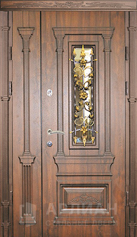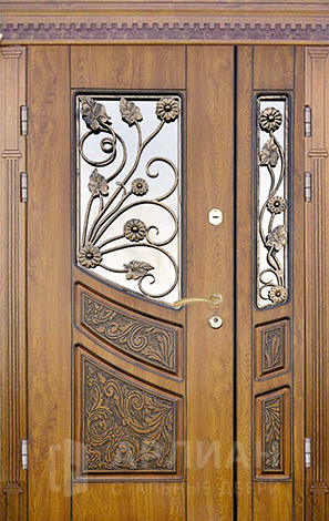 Двухстворчатая входная дверь со стеклом и ковкой №9