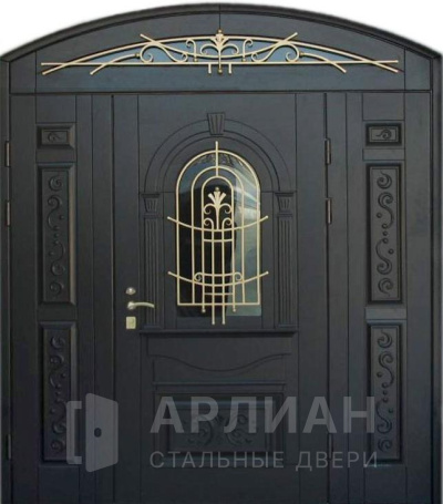 Входная двустворчатая дверь со стеклом и ковкой в загородный дом №14